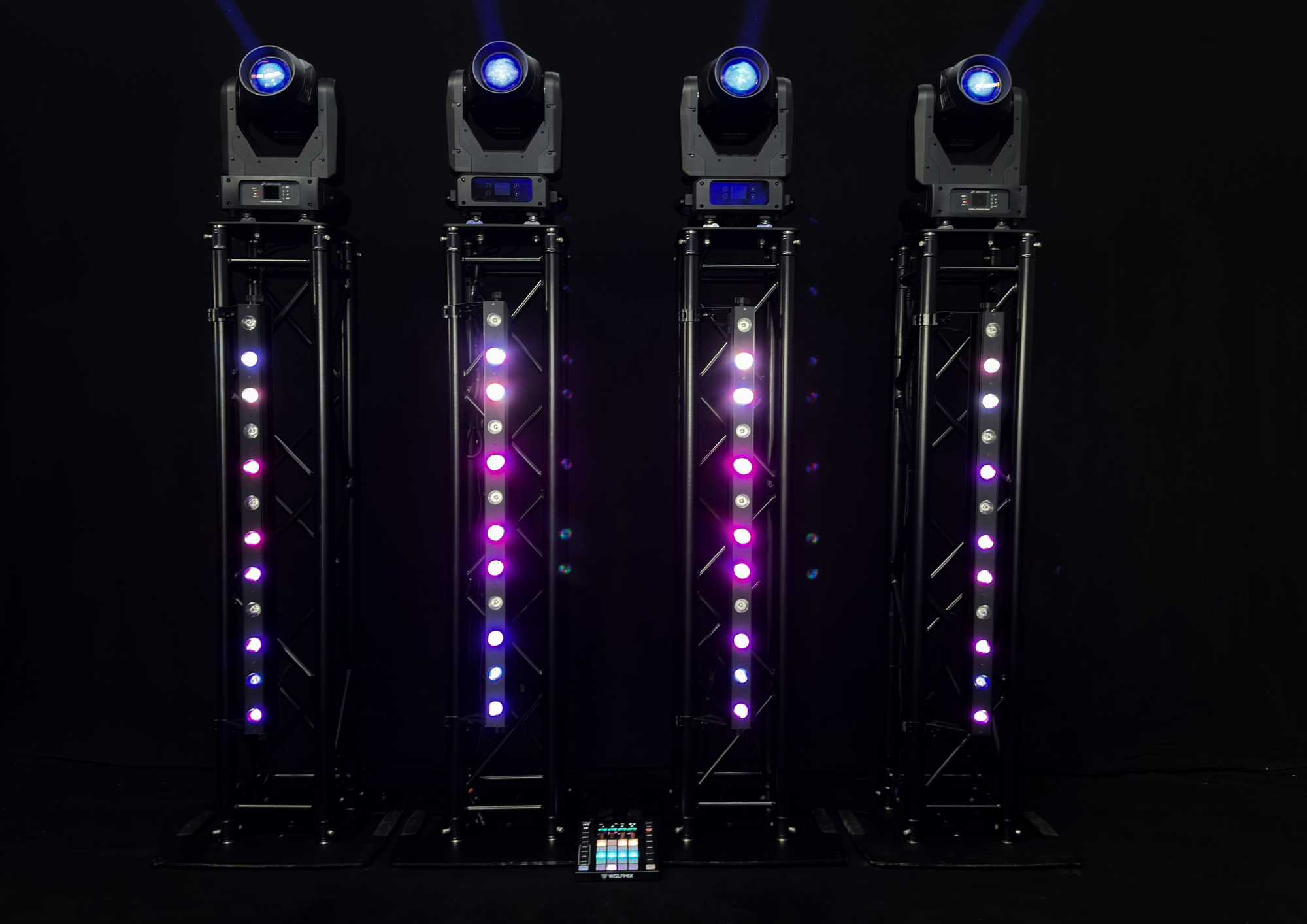 Deze set wordt standaard geleverd als complete lichtshow met 4 trusspalen (moving heads + LED-bars) en de Wolfmix W1 MK1 controller.